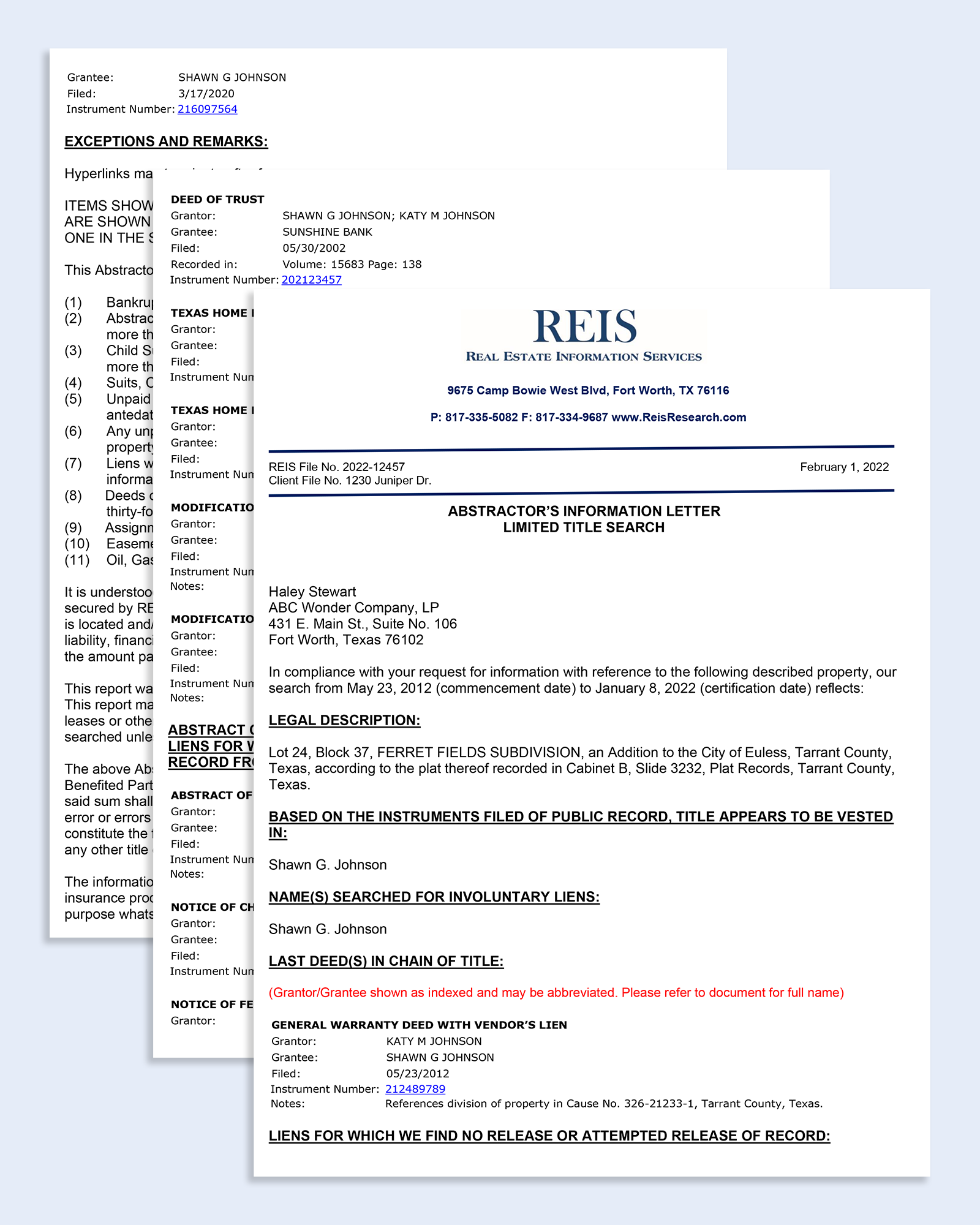 - Open voluntary and involuntary liens and associated instruments filed on the subject property.