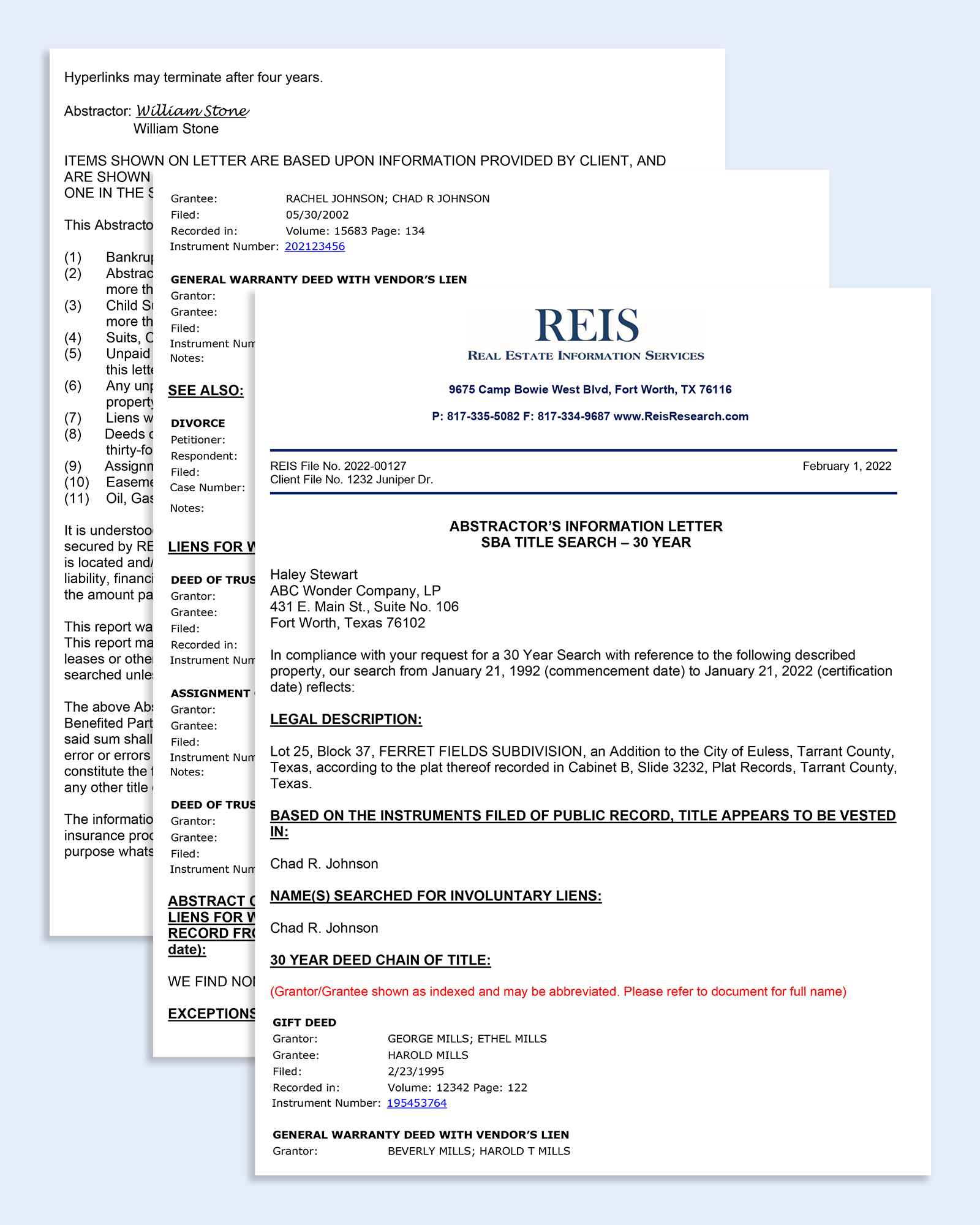 - Ten-year search of owner name(s) for unreleased state and federal tax liens, child support liens, and abstracts of judgments in the county searched.