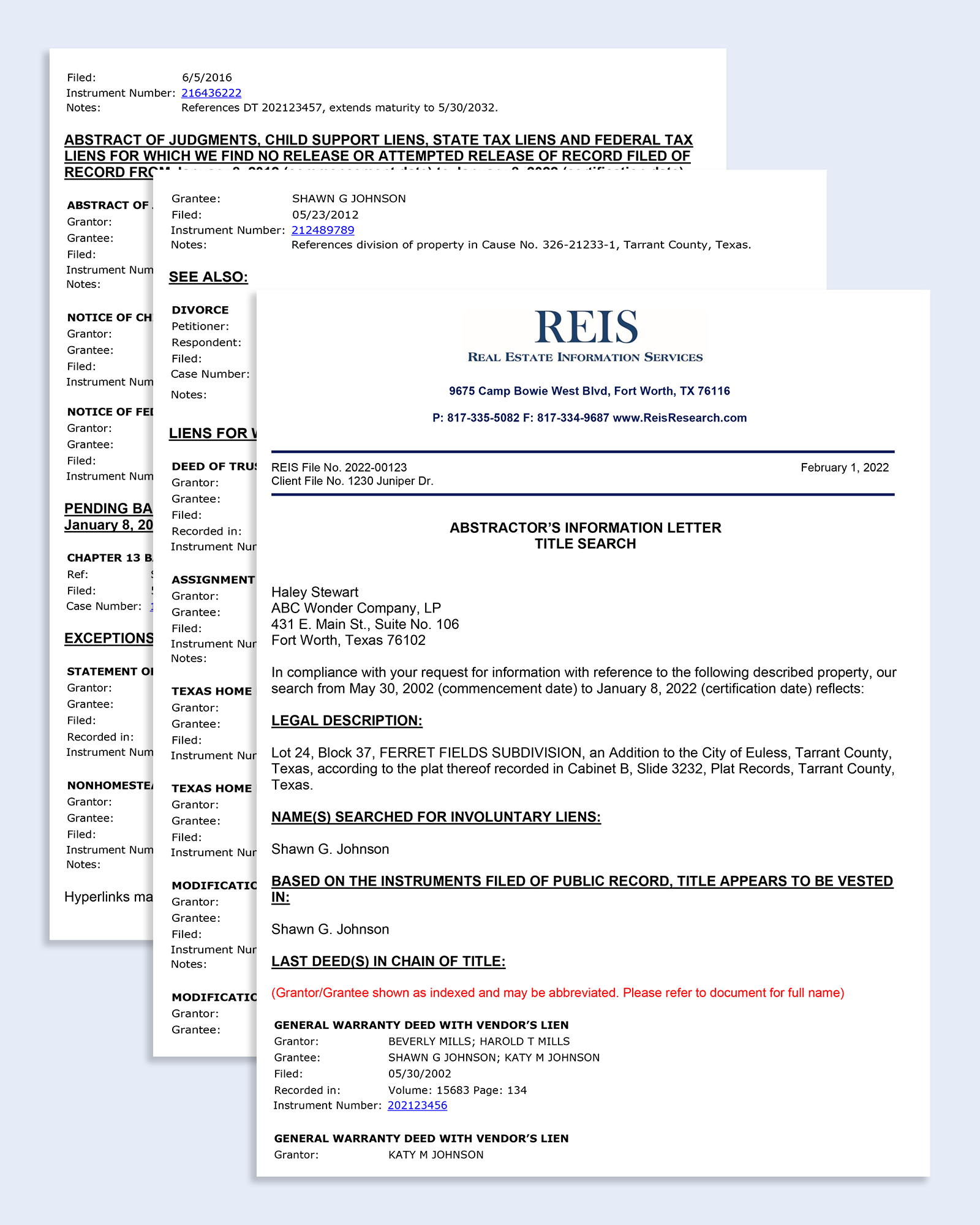 - Ten-year search of owner names for unreleased state and federal tax liens, child support liens, and abstracts of judgments in the county searched.